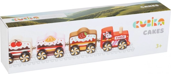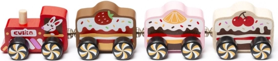 Geef kinderen treinpret in een heerlijk zoet design. Het houten CUBIKA-treintje “Cakes” combineert een aantrekkelijk taartjesuiterlijk met functionele magnetische koppelingen tussen de wagons. Zorgvuldige afwerking van Europees hout en een fijne oppervlaktebehandeling zorgen voor een lange levensduur en veilig spel.