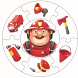 Ronde puzzel met een brandweerman en uitrusting (brandweerauto, slang, bijl) die de verbeelding prikkelt en leren via spel ondersteunt.