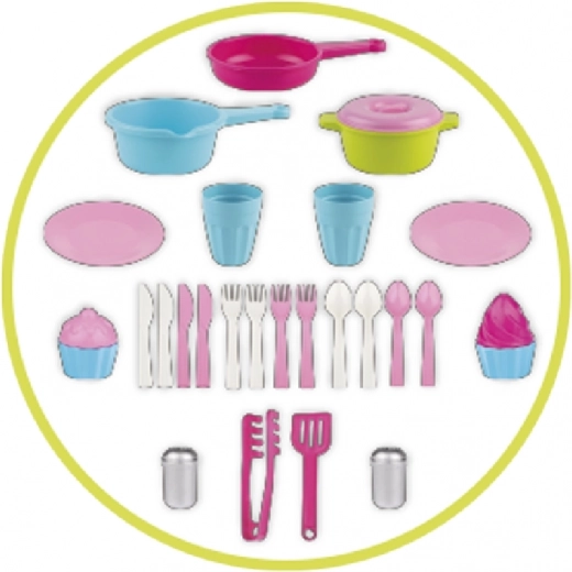 - Inhoud van de verpakking: bestekset voor 4 kinderen, besteklade, oven met bakplaat, kookplaat, gootsteen met kraan, 3 pannen, 2 bekers, 2 bordjes, 2 tangen, zoutvaatje, pepervaatje en 2x cupcake