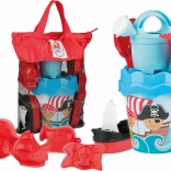 Emmer (Ø 17 cm), zeef, gieter 0,5 l, schepje, harkje, piratenbootje, 4 vormpjes
