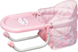 - Draagbare stoel met eetblad en veilige bevestigingen onder het tafelblad (max. tafelbladdikte 7 cm), afmetingen 38 × 28 × 14 cm (l × b × h).