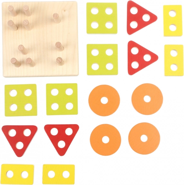 Kleurige cirkels, vierkanten, driehoeken en rechthoeken met gaten worden op de pinnetjes van de basis geplaatst. Kinderen sorteren zo vanzelf op vorm en kleur en trainen hun logisch denken.