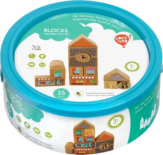 Ontdek de magie van creatief bouwen met de houten set Lucy & Leo stad. De set bevat 25 hoogwaardige houten delen, waaronder 2 rijdende autootjes, in verschillende vormen en kleuren om huisjes en straatjes te bouwen. Geïllustreerde elementen zoals ramen, daken en etalages prikkelen de fantasie en thematisch spel. Het speelgoed ondersteunt fijne motoriek, logisch denken en creativiteit, en na het spelen berg je alles eenvoudig op in de praktische ronde box met deksel en handvat.