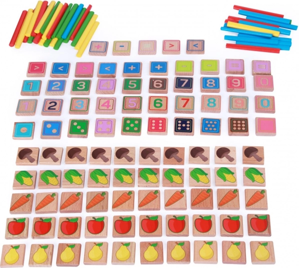 De set bevat houten kaartjes met cijfers, stippen zoals op dobbelstenen, afbeeldingen van fruit en groenten, verder wiskundige tekens en gekleurde telstokjes van 8 cm. De onderdelen voelen prettig aan en zijn duurzaam voor dagelijks spel.