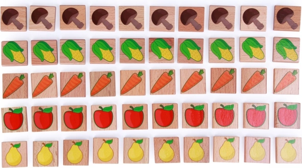 Kaartjes met fruit en groenten ontwikkelen het visuele waarnemen, de woordenschat en ondersteunen het toewijzen en categoriseren.