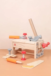 Ontdek het leuke en leerzame speelgoed voor kleine vakmensen: een houten gereedschapsset met werkbank van het merk LUCY & LEO. De compacte kist, die bij omdraaien verandert in een werkbank, bevat 15 onderdelen, waaronder een hamer, zaag, schroeven en een bankschroef. Het speelgoed stimuleert de fijne motoriek, creativiteit en logisch denken, en is gemaakt van kwalitatief hout met een gladde afwerking voor veilig spelen.
