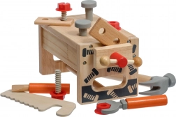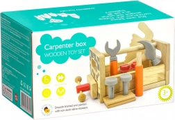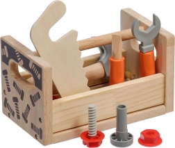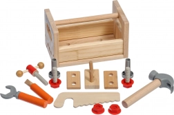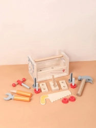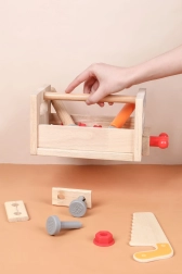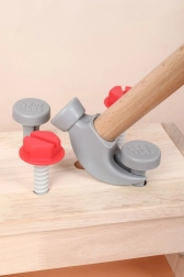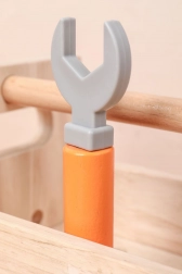 De set bevat gevarieerd kinderspeelgoedgereedschap: hamer, zaag, schroevendraaier, sleutel, schroeven en moeren, bankschroef en gladde houten onderdelen met gaten. Alles heeft zijn eigen plek, zodat kinderen orde leren bewaren en basisvaardigheden met bevestigingsmateriaal onder de knie krijgen. Het spel ondersteunt creatieve bouwspelletjes, oog-handcoördinatie en geduld.