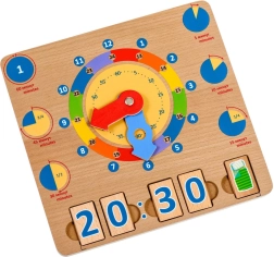 De houten speelplaat We leren klokkijken is een uitstekende didactische tool die natuurlijk leren door spel ondersteunt. Grote kleurrijke wijzers en duidelijk onderscheiden tijdssegmenten maken het voor kinderen makkelijker om uren, minuten en dagelijkse activiteiten op specifieke tijdstippen te begrijpen.