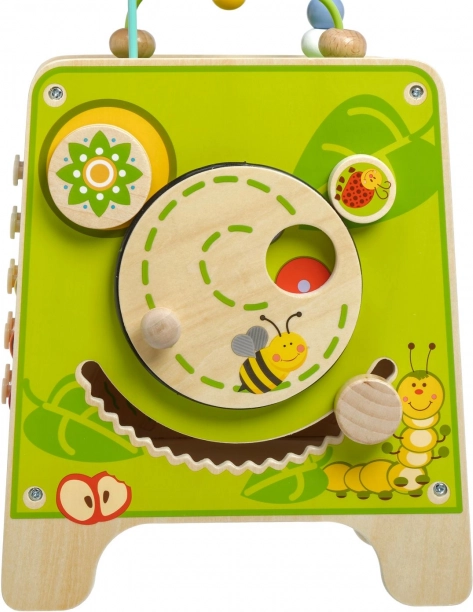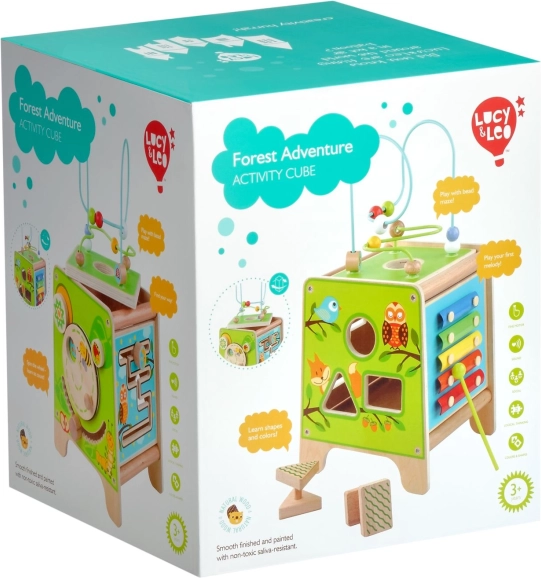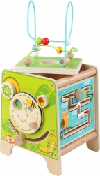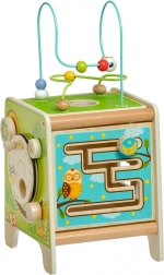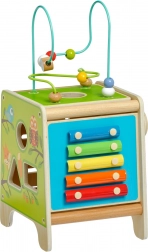 Deze kleurrijke houten activiteitenkubus biedt kinderen uren zinvol spel. Het bovenste kralenlabyrint kan worden verwijderd en omgekeerd in de kubus worden geplaatst voor eenvoudig opbergen. Op de zijkanten ontdekken kinderen een xylofoon met stokjes, een vormenstoof met tweedelige draaiende geometrische vormen, een motorisch doolhof, een roterend wieltje, draaielementen en een leuke activiteit met het verschuiven van een pinnetje in een groef.