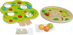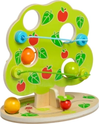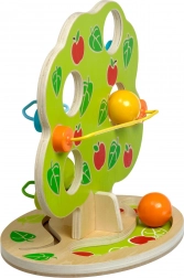 De stijlvol vormgegeven knikkerbaan in boomvorm heeft meerdere cascaderails aan de zijkanten. Leg een van de gladde, grote houten bollen bovenop en kijk hoe hij naar beneden rolt, een ritmisch “klikken” maakt en tot stilstand komt aan de voet van de boom. Het speeltje is ideaal voor actieve kinderen die houden van beweging, geluiden en het ontdekken van oorzaak en gevolg.