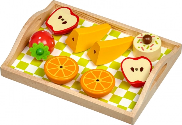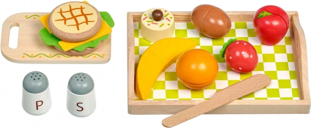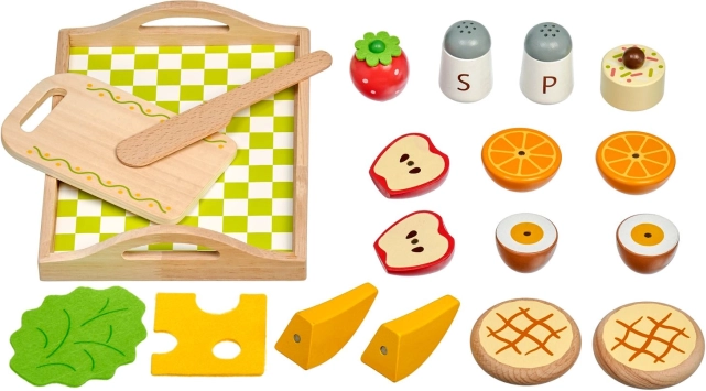 De set bevat alles voor kleine koks: een dienblad met ruitpatroon, snijplank, mes, zoutvaatje en peperbus, evenals een gevarieerde selectie etenswaren – brood, kaas en sla, ei, banaan, appel, sinaasappel, aardbei en een klein taartje. De nadruk op kwalitatieve materialen en duurzame afwerking garandeert een lange levensduur en veilig spel.