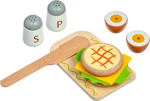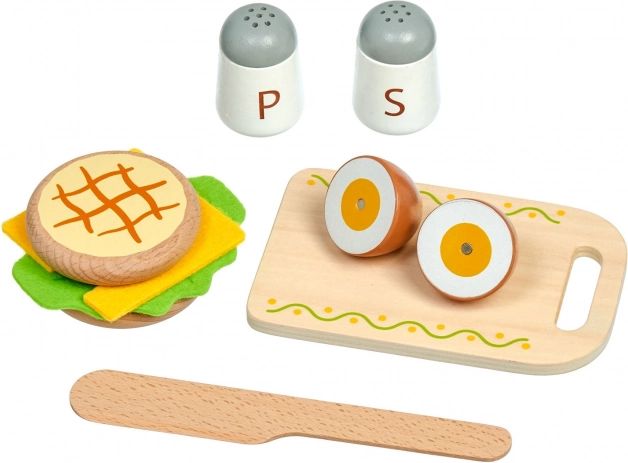 Stevige houten componenten worden aangevuld met textiele plakjes kaas en sla. Duurzame uitvoering en levendige kleuren zorgen voor lang en veilig speelplezier.