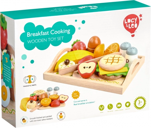Deze houten speelset bootst een rijk ontbijt op een dienblad realistisch na en nodigt kinderen uit tot eindeloze fantasie. De afzonderlijke voedselstukken zijn met magneten verbonden, zodat kinderen ze herhaaldelijk met het houten mes op het snijplankje kunnen “snijden” en weer samenstellen. Dit bevordert natuurlijk leren, oog-handcoördinatie en het nadoen van activiteiten van volwassenen.