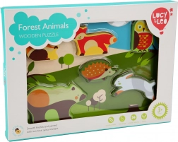De Lucy & Leo inlegpuzzel met bosdieren bevat 7 gekleurde houten stukjes zonder knopjes, die kinderen gemakkelijk kunnen vastpakken en in de overeenkomstige uitsparingen kunnen plaatsen. Elk stukje is dik genoeg om zelfstandig te blijven staan, wat de speelmogelijkheden en fantasie vergroot.