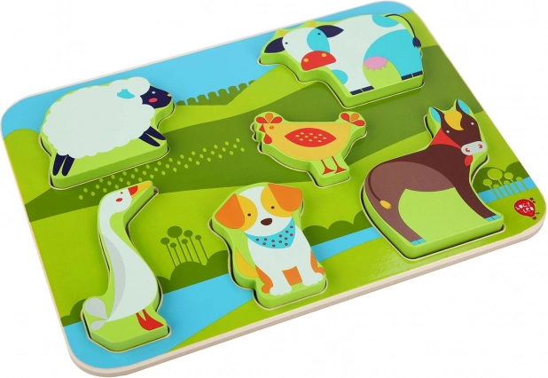 De houten puzzel met boerderijthema valt bij zowel meisjes als jongens in de smaak dankzij de diepe kleuren en het prettig gladde oppervlak. Elk van de 7 dieren heeft zijn eigen vorm en kan eenvoudig in de bijbehorende uitsparing worden gelegd. Door de grootte en dikte zijn de stukjes makkelijk vast te pakken en veilig voor zelfstandig spel.