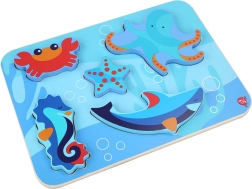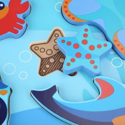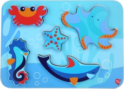 De houten kinderpuzzel met het thema zeedieren is ontworpen voor spelenderwijs leren. Zes kleurrijke stukjes – bijvoorbeeld een octopus, zeester en zeepaardje – passen precies in de gefreesde vormen op de stevige basis met oceaanthema. De stukken zijn groot genoeg om goed vast te houden en kunnen dankzij hun dikte zelfstandig staan.