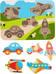 Deze kwalitatieve houten inlegpuzzel met het thema vervoersmiddelen valt op door heldere kleuren en duidelijke vormen die kinderen makkelijk kunnen vastpakken en op hun plek leggen. Sommige stukken kunnen dankzij hun dikte zelfs zelfstandig staan, zodat kinderen er ook los van het bord mee kunnen spelen.