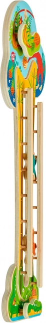 Ontdek een slimme en boeiende speelgoedset met een fris junglethema die kinderen minutenlang bezighoudt. Na ophangen aan de muur bespaart hij ruimte in de kinderkamer en creëert hij een aantrekkelijke speelzone. Twee houten aapjes dalen af over een dubbele baan, maken salto’s en draaien, waardoor elke rit leuk en anders is.