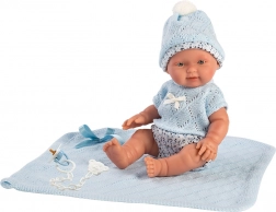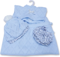 De outfit voor een babypop van 26 cm bevat een truitje, een mutsje en een broekje. Hij is ontworpen om maximaal comfort en elegantie aan het poppenspel toe te voegen. De set bevat ook een fijn gebreid dekentje dat de look compleet maakt. Deze set is verpakt in een transparante verpakking met een plastic of kartonnen hangertje.