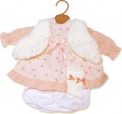 Verwen je pop met een nieuwe garderobe: een roze jurkje met subtiel patroon, aangevuld met een zacht wit giletje en een comfortabel broekje. De set is ontworpen voor poppen in maat 42 cm en valt op door op elkaar afgestemde details en het gemakkelijke aankleden.