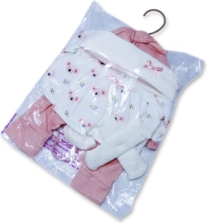De vierdelige set bevat een mutsje, outfit, broek en sokken in bijpassende kleuren, zodat de pop altijd mooi afgestemd en warm is.