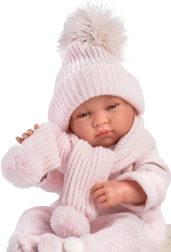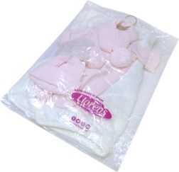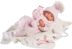 Stijlvolle 3-delige outfit voor pop baby New Born van het merk Llorens, maat 43-44 cm, bevat een decoratieve fleecedeken met strik. Gemaakt in Spanje en biedt een perfecte uitstraling voor uw poppen.