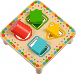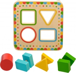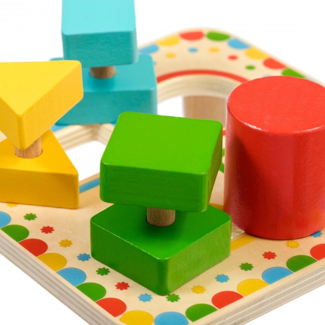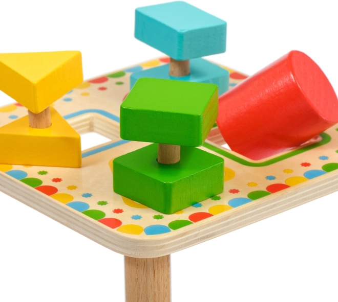 De plaat op stabiele pootjes heeft vier kleur omrande openingen die matchen met de kleuren van de afzonderlijke stukjes. De set is ideaal voor zelfstandig spel of samen ontdekken met ouders en is een uitstekende houten educatieve speelgoed voor kleuters.