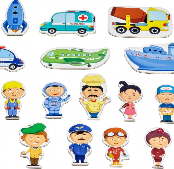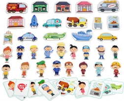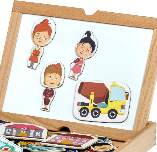 Deze creatieve magnetische set brengt de wereld van beroepen spelenderwijs dichterbij – van brandweerman en politieagent tot kok of piloot. Dankzij de dubbelzijdige kaarten kunnen kinderen de juiste combinaties leggen of eigen figuurtjes en scènes maken. Het praktische houten koffertje met magnetisch bord zorgt voor handig opbergen van alle onderdelen en gemakkelijk meenemen op reis.