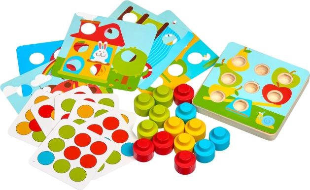 - 1× houten basis met gaten, 14× grote gekleurde houten pin, 12× dubbelzijdige kaart (6 geperforeerde afbeeldingen + 6 gekleurde sjablonen)