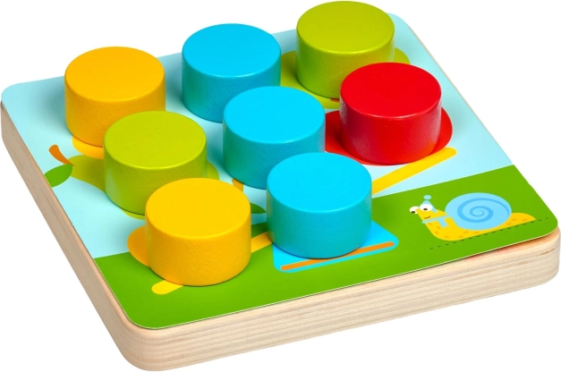 De grote houten pinnen zijn gemakkelijk vast te pakken en in de gaten te plaatsen, wat de oog-handcoördinatie ondersteunt en kleuren spelenderwijs laat leren.