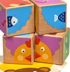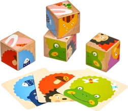 Met vier houten blokjes leggen kinderen tot wel zes verschillende afbeeldingen volgens de meegeleverde voorbeelden. Elke draai brengt een nieuwe, leuke opdracht en houdt de aandacht van kleine bouwers vast.