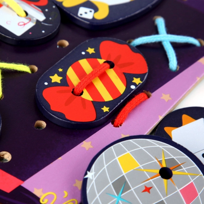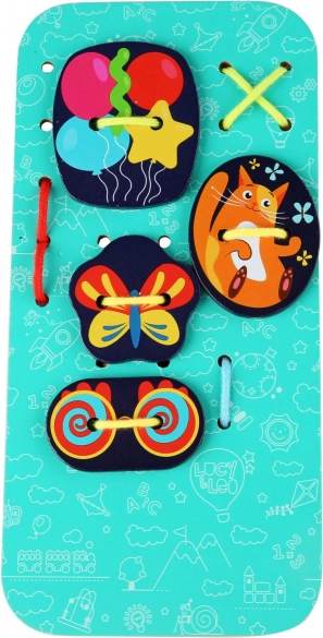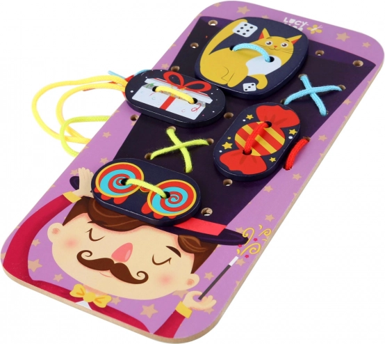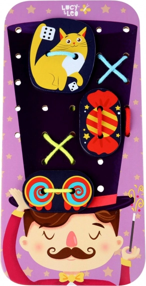 Ontdek de creatieve houten rijgset van Lucy & Leo, die de fijne motoriek, creativiteit en het herkennen van kleuren en vormen stimuleert. De set bevat 31 houten onderdelen, 4 gekleurde veters en een grote onderplaat met een goochelaar, waarop kinderen naar eigen fantasie versieringen kunnen doorrijgen en bevestigen.