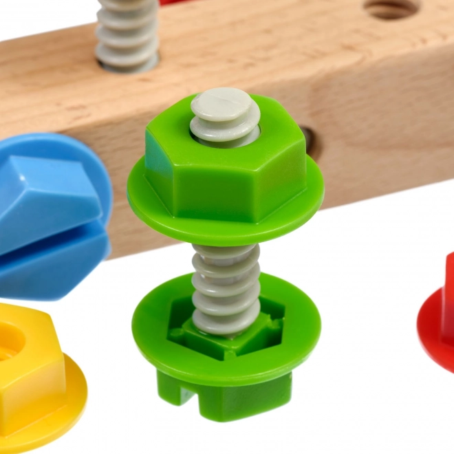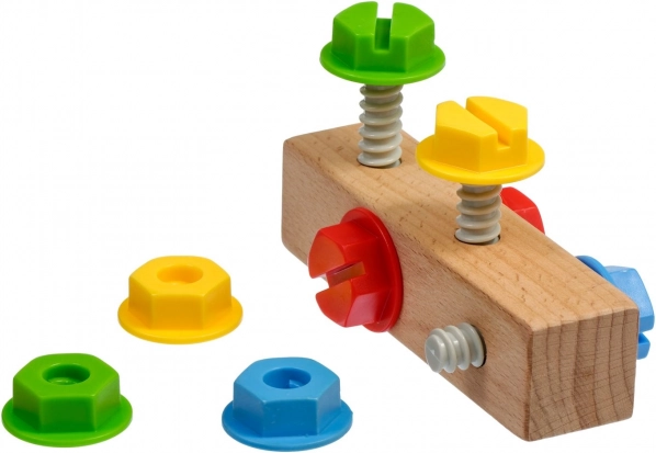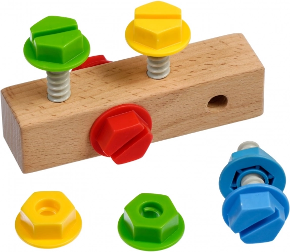 Het speelgoed is ideaal voor kleuters en ondersteunt natuurlijk leren door spel. Dankzij de heldere kleuren oefenen kinderen eenvoudig het koppelen en sorteren van kleuren, terwijl het schroeven in het houten blok technisch inzicht en geduld ontwikkelt.