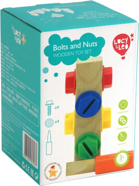Deze hoogwaardige houten set met vier schroefdraden en kleurrijke schroeven met moeren biedt kinderen een veilige ruimte om te ontdekken hoe dingen werken. Onderdelen kunnen met de vingers of met de meegeleverde houten schroevendraaier worden vastgedraaid, wat greep, oog-handcoördinatie en concentratie versterkt.