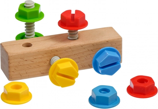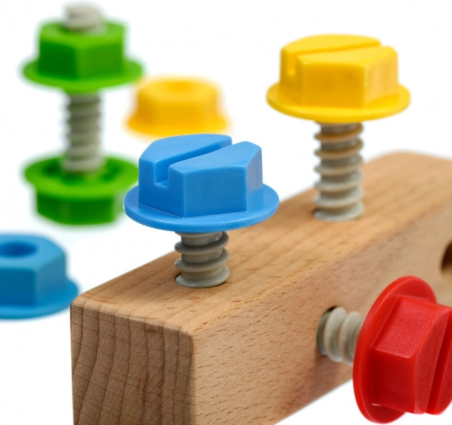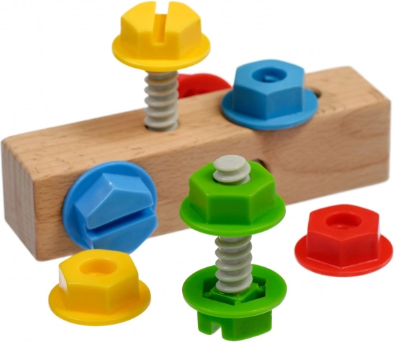 Ontdek een leuke educatieve set voor kleine technici: een houten blok met schroefdraad, kleurrijke kunststof schroeven met moeren en een houten schroevendraaier. Het speelgoed ontwikkelt fijne motoriek, logisch denken, geduld en kleurenherkenning en is een geweldige Montessori-hulpmiddel voor dagelijks spel.