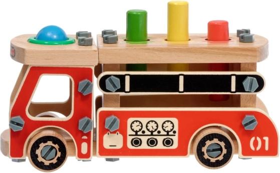 Deze creatieve set combineert een bouwset en hamerspel in één. Kinderen bouwen eerst een robuuste houten brandweerwagen en gebruiken vervolgens de vier openingen in de laadbak voor het leuk inslaan van gekleurde elementen met het hamertje. Dankzij de heldere kleuren en diverse vormen ondersteunt het speelgoed natuurlijk leren en concentratie.