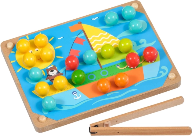 De houten basis met gaatjes, gekleurde pinnen en het pincet stimuleren kinderen tot een precieze greep en trainen zowel de fijne motoriek als de oog-handcoördinatie.