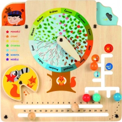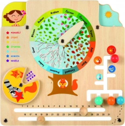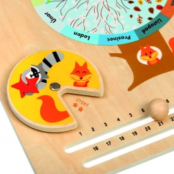 De houten natuurkalender van LUCY & LEO is een ideale hulp voor spelenderwijs leren. In het midden van de plaat staat een bladrijke fruitboom met een aanwijzer voor 12 maanden, waardoor kinderen eenvoudig de winter met sneeuw, de lente met bloesem, de zomer met fruit en de herfst met vallende bladeren kunnen verbinden. Kinderen leren daarnaast de dagen van de week, het aantal dagen in de maand, het weer, de temperatuur en passende kleding voor verschillende omstandigheden herkennen.
