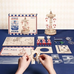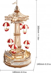 Deze verfijnde 3D houten puzzel is geïnspireerd op de klassieke parachutetoren uit het pretpark. De zeshoekige basis en de zijdelingse transparante ramen laten warm licht door, wat de unieke sfeer benadrukt. De molen wordt aangedreven door een batterijmotor en verlicht met LED-lampjes, terwijl de touchbediening het mogelijk maakt beweging en geluid afzonderlijk te regelen.