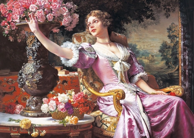 3.000 stukjes vormen een elegant beeld van een vrouw in een prachtige paarse jurk, omgeven door bloemen.
