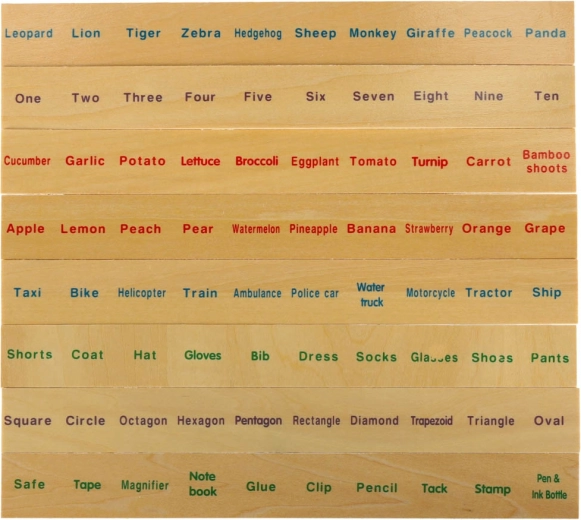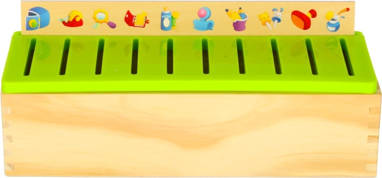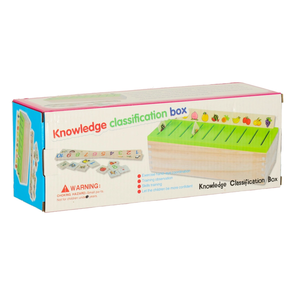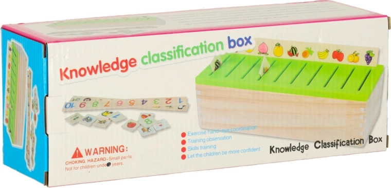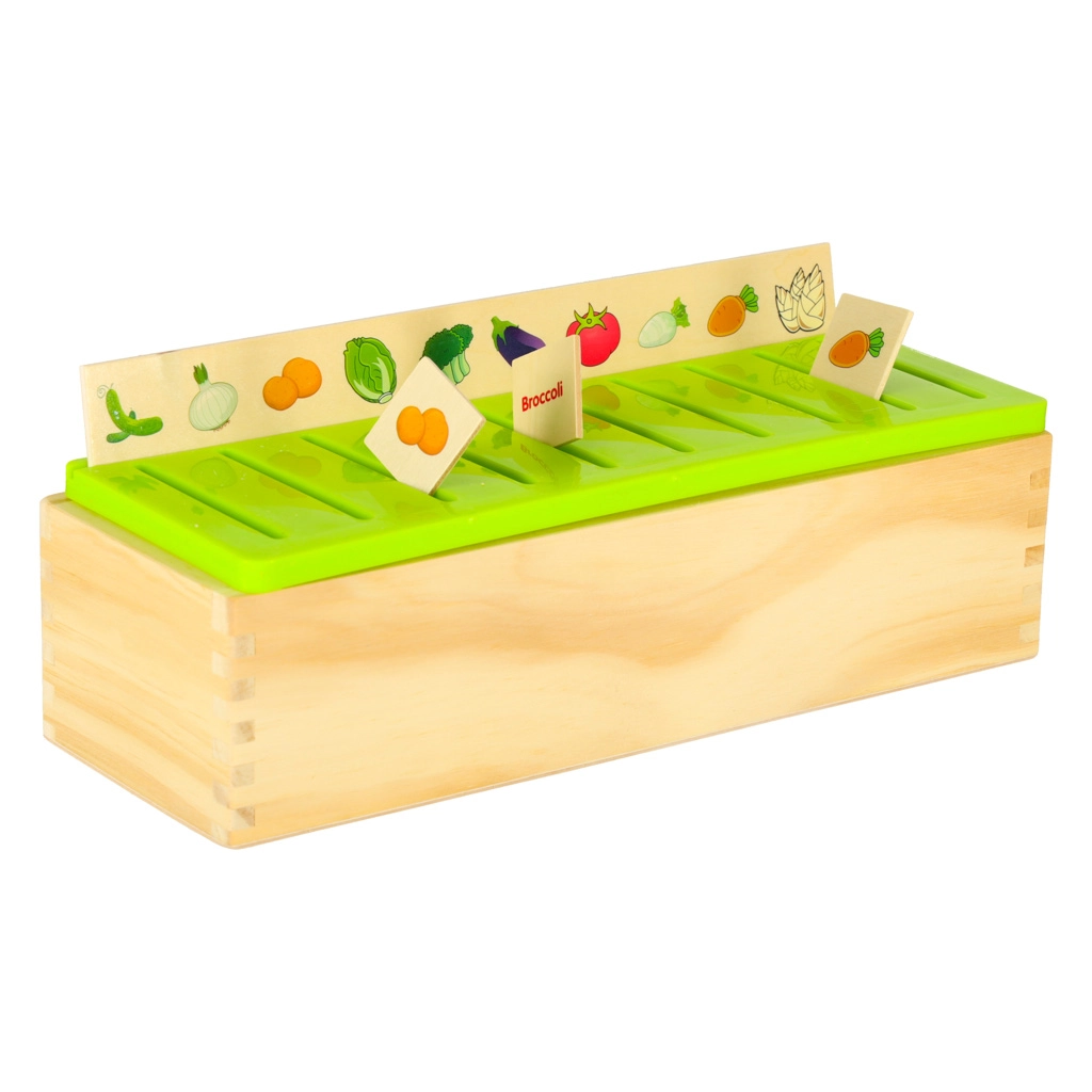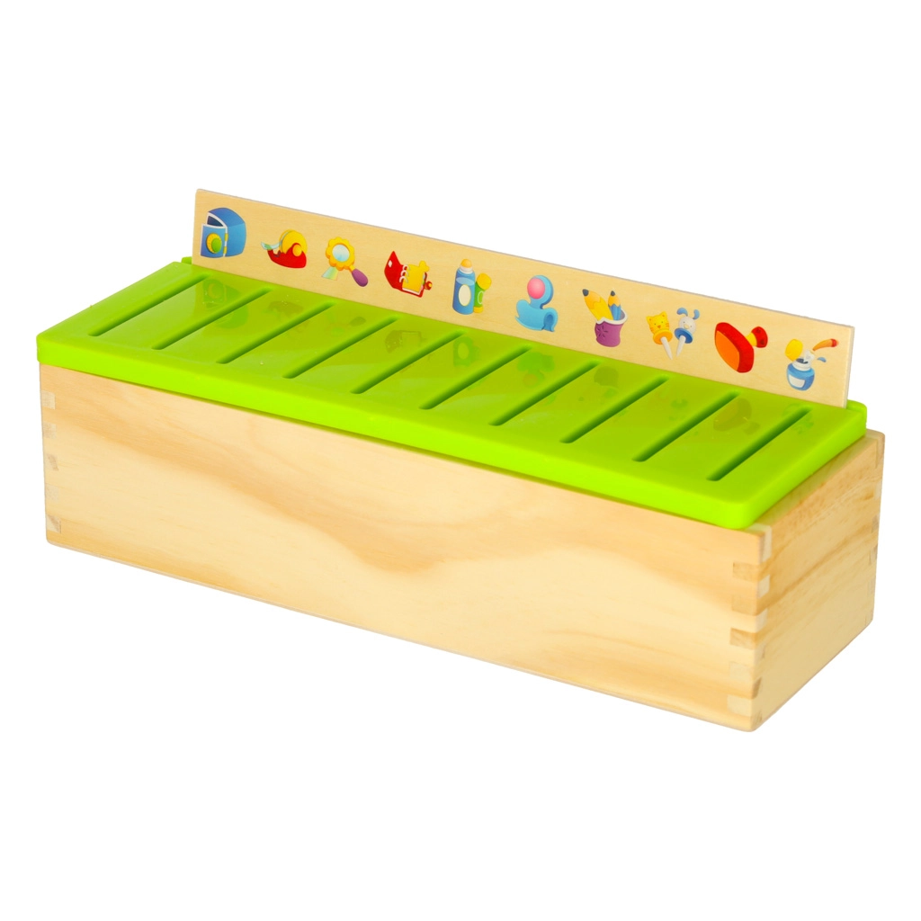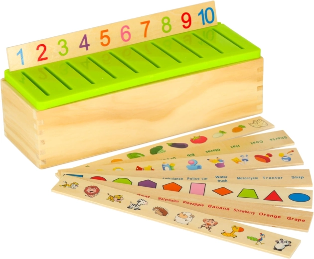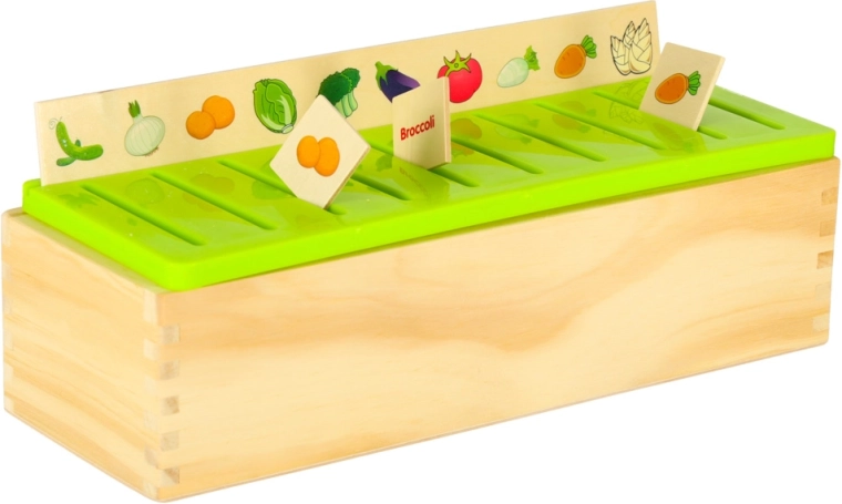 De educatieve sorter is een doordachte houten kist met geventileerde groene deksel en een set grote themaborden (getallen, vormen, dieren, fruit en groenten, vervoersmiddelen enz.). Kinderen koppelen kleine houten kaartjes met kleurrijke illustraties en Engelse termen aan de overeenkomstige afbeeldingen op het bord en schuiven ze in de juiste gleuf. Zo trainen ze observatie, geheugen, concentratie en bouwen ze woordenschat op.