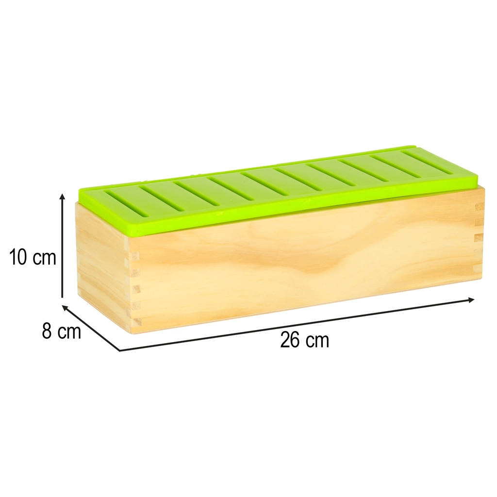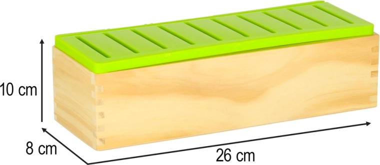Massief hout, glad afgewerkte randen en een afneembare kunststof deksel met gleuven voor eenvoudig inwerpen en reinigen. Ideaal voor dagelijks spel.