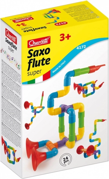 Met de bouwset Quercetti Saxoflute Super kunnen kinderen hun eigen muziekinstrumenten maken, zoals saxofoons, fluiten en trompetten van gekleurde plastic buizen en connectors. De set bevat 24 onderdelen die verschillende combinaties en vormen mogelijk maken. Hierdoor ontwikkelt het speelgoed niet alleen creatief denken, maar ook fijne motoriek en verbeeldingskracht.