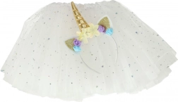 Het betoverende eenhoornkostuum brengt kinderen veel plezier en ruimte voor fantasie. Het lichte tuturokje met sterretjes zwiert mooi mee bij beweging, terwijl de haarband met gouden hoorn en bloemen de hele styling een magische touch geeft.
