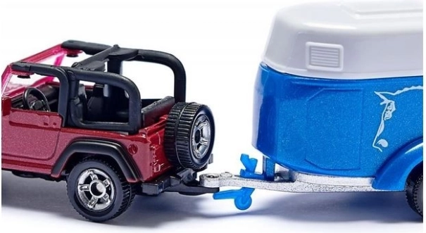 Een Jeep-voertuig met een speciale trailer voor het vervoer van paarden, vervaardigd uit hoogwaardige metalen en kunststof onderdelen.