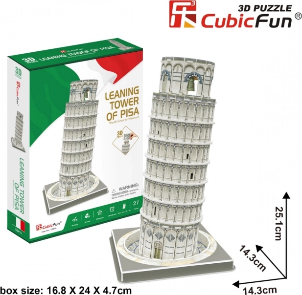 Met deze 3D-puzzelset kun je je eigen replica van de wereldberoemde Scheve Toren van Pisa maken. De set bevat 27 stukjes gemaakt van een speciaal materiaal dat aan schuim doet denken. De stukjes zijn genummerd, voorgesneden op vellen en eenvoudig uit te nemen en te monteren volgens de meegeleverde instructies. Voor de montage is geen lijm of speciaal gereedschap nodig, wat betekent dat ook beginners van dit project kunnen genieten. Na montage heeft het bouwwerk afmetingen van 14,3 x 14,3 x 25 cm.