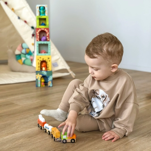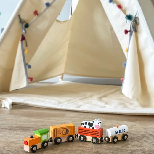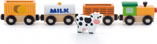 De set bevat een locomotief en drie wagons – een tankwagon gemarkeerd met MILK, een veewagon met een koe en een laadwagon. Gladde randen en een robuuste uitvoering zijn ideaal voor de kinderkamer en voor kleuterscholen.