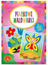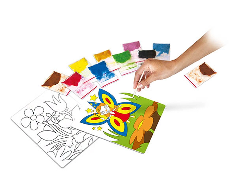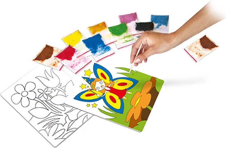 Het creatieve spel met zandtekenen bestaat uit het stapsgewijs onthullen van afzonderlijke voorgesneden delen van het plaatje, zodat het kleverige oppervlak van het geselecteerde fragment zichtbaar wordt. Elk onthuld fragment wordt bestrooid met zand in de kleur die overeenkomt met het voorbeeld op de handleiding en op de doos.