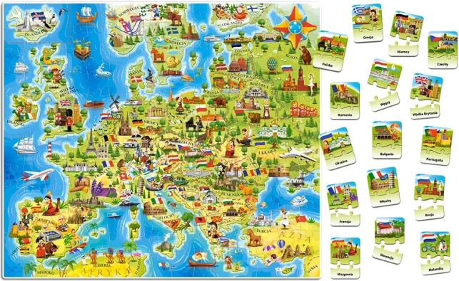 De educatieve puzzel Castorland Kaart van Europa combineert plezier met leren. Kinderen leggen een grote kaart van het continent en ontdekken dankzij de quizstukjes tegelijk hoofdsteden, bezienswaardigheden en typische symbolen van afzonderlijke landen. Op de kaart vind je bijvoorbeeld de Karelsbrug in Tsjechië, het Colosseum in Italië, de Eiffeltoren in Frankrijk, de Brandenburger Tor in Duitsland, de Sagrada Família in Spanje en de Akropolis in Griekenland.