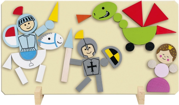 Creatieve magnetische legset met het thema ridders die de fijne motoriek, creativiteit en fantasie van kinderen ontwikkelt. De set bevat een magnetisch bord, standaards en gekleurde houten stukjes met magneet, waarmee kinderen verschillende figuren en scènes uit de middeleeuwen kunnen samenstellen.